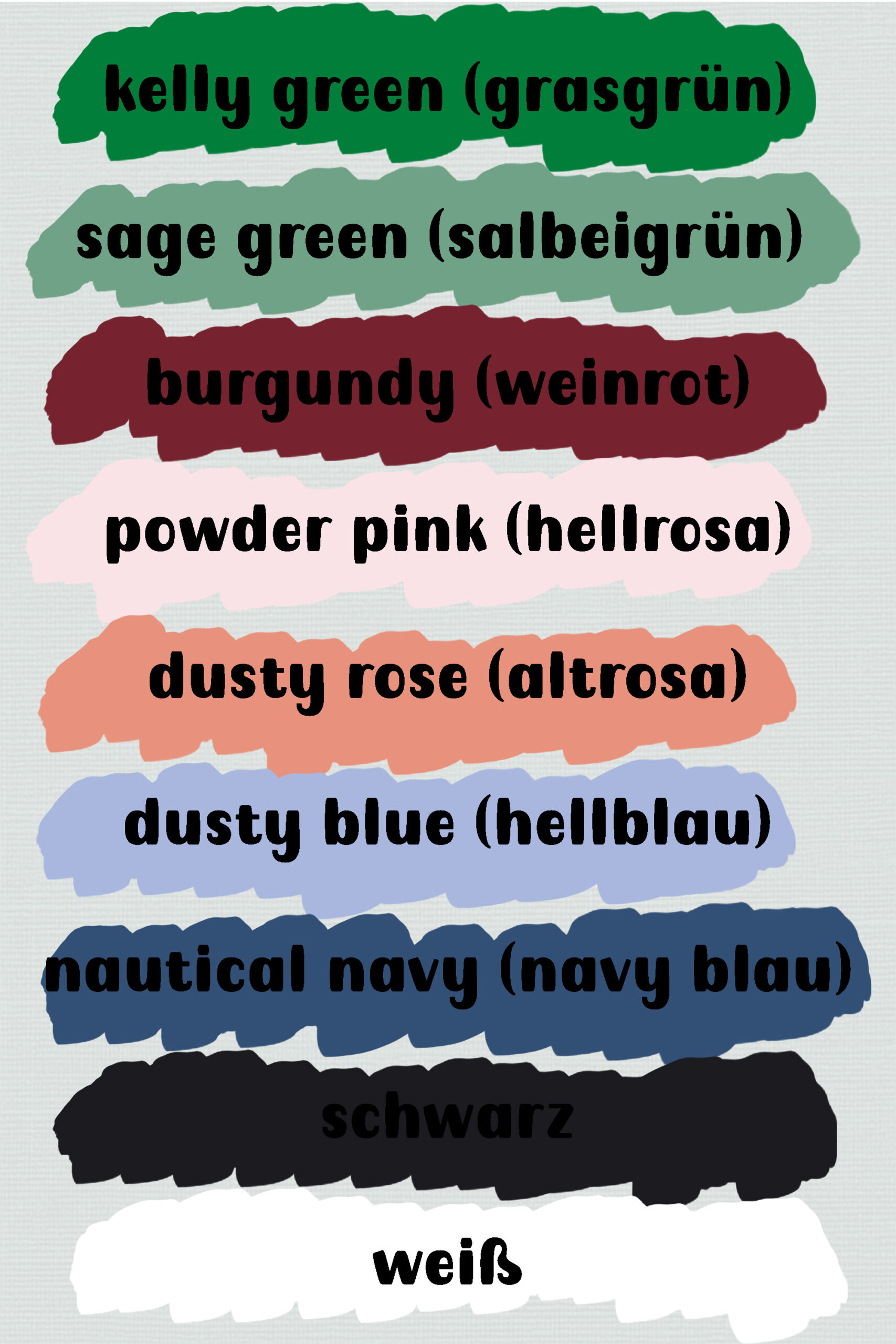 | Farbe | kelly green (grasgrün), camouflage green (olivgrün), schwarz, weiß, burgundy (weinrot), powder pink (hellrosa), dusty blue (hellblau) |